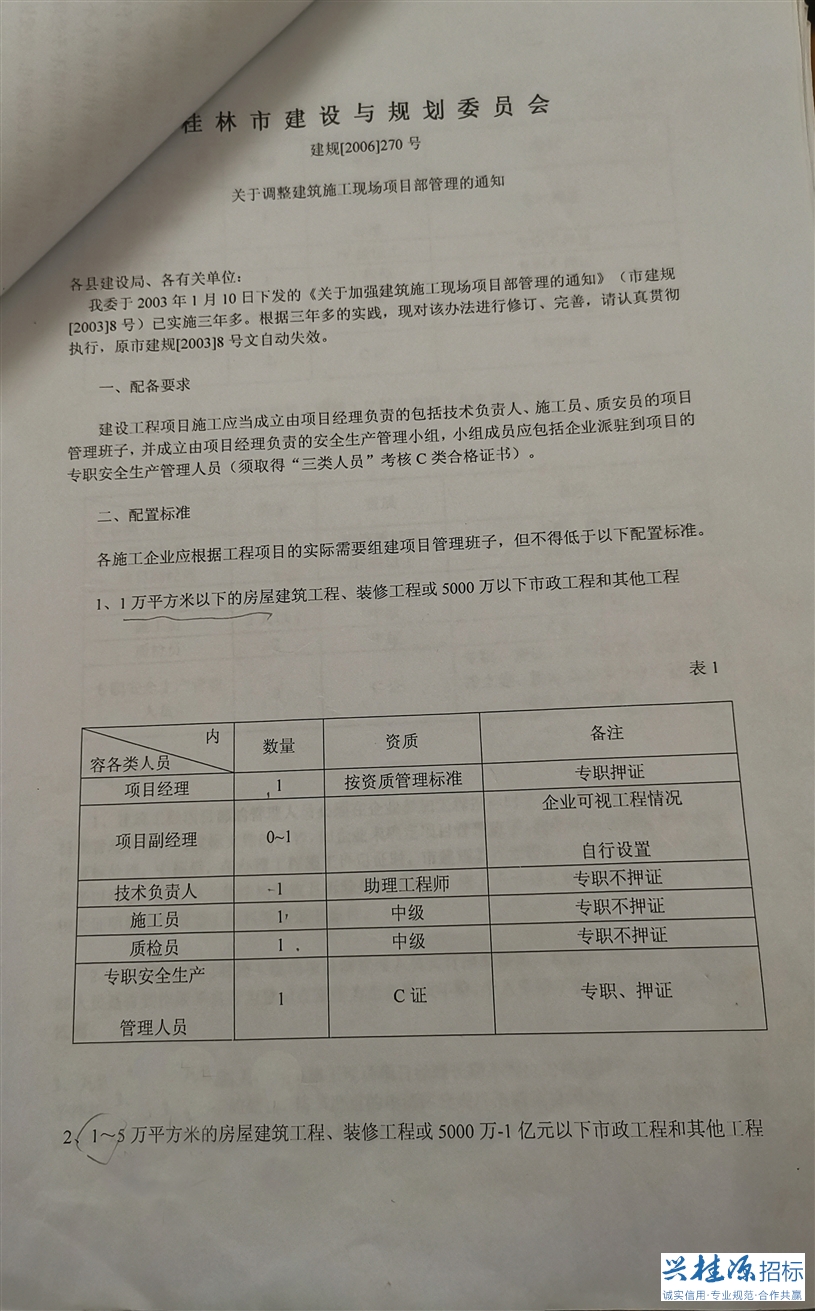 3、桂林建設與規(guī)劃委員會建規(guī)【2006】270號《關于調整建筑施工現(xiàn)場項目部管理的通知》詳見公告附件1。